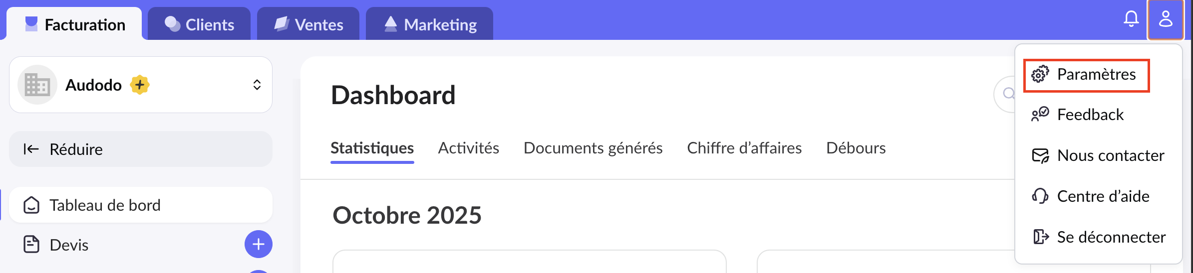 Basculez d'une comptabilité à l'autre de vos organisations à l'aide du menu déroulant en haut, à gauche de votre écran.