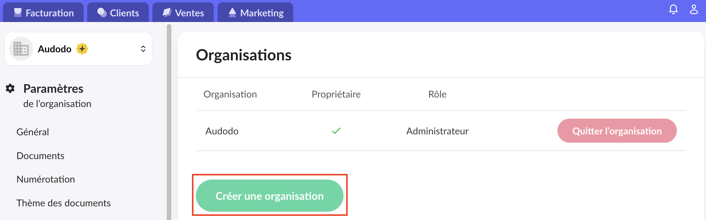 3. Cliquer sur "Créer une organisation".