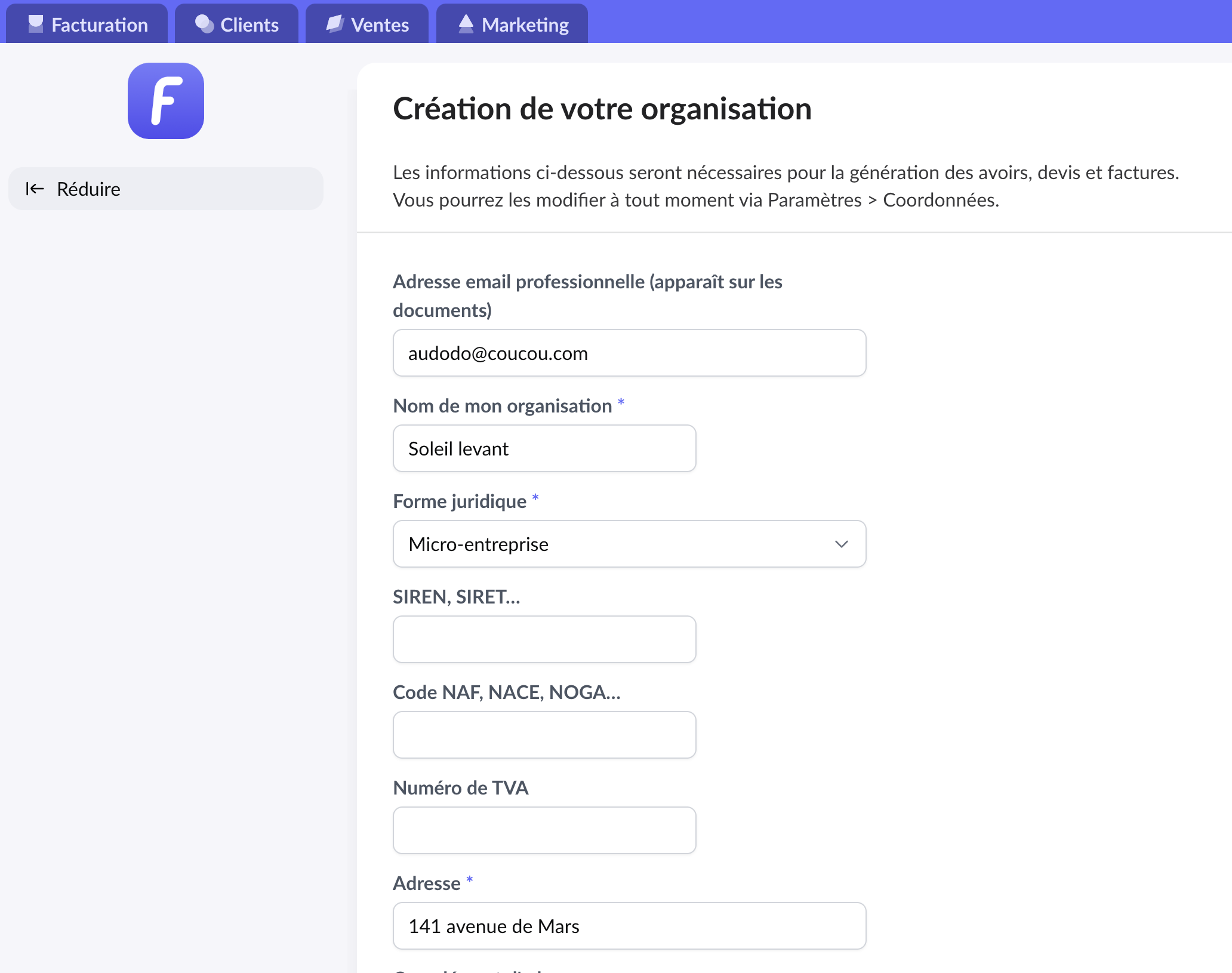 4. Remplir les champs obligatoires concernant les coordonnées de l’entreprise.