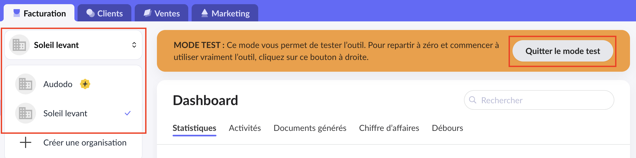 7. Quittez le mode test après avoir testé et paramétré votre nouvelle organisation.