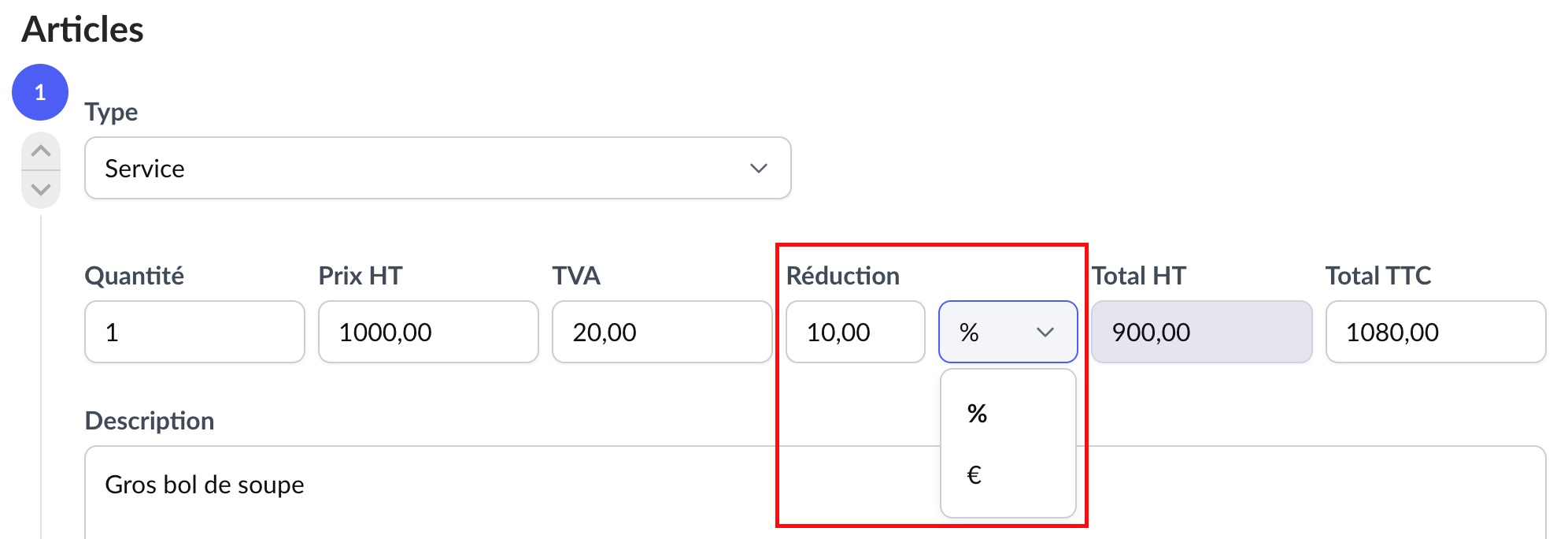 Lors de l'édition de votre facture, après avoir ajouté une ligne de facturation (produit, service, etc.), vous pouvez appliquer une remise en même temps que vous remplissez les champs "Quantité", "Prix HT", "TVA", etc.