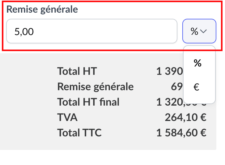 Lors de l'édition de votre facture, vous pouvez également appliquer une remise générale sur le montant total de cette dernière.