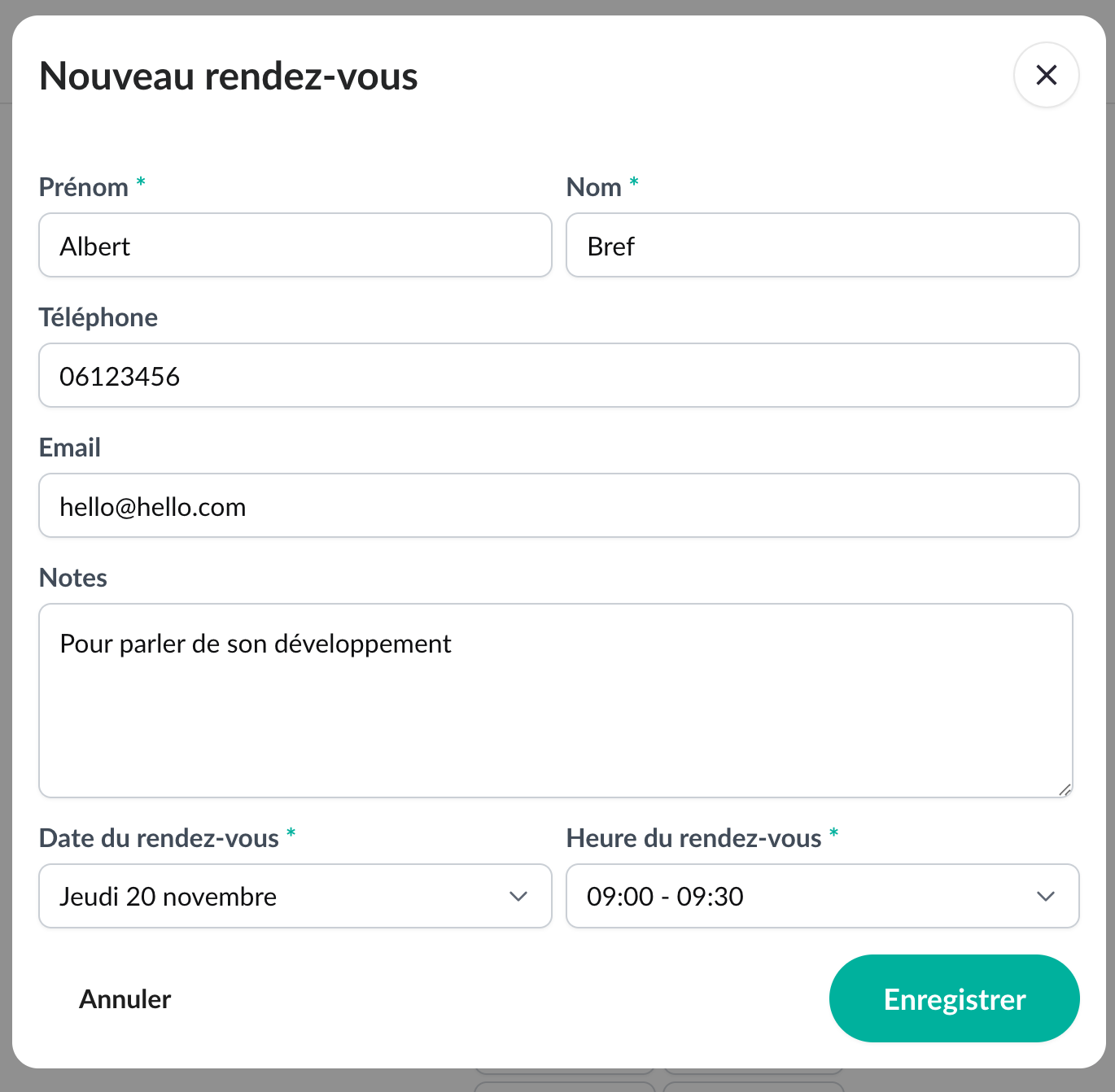 2. Depuis la fenêtre de prise de rendez-vous, renseignez les coordonnées de votre contact et définissez la date et l'heure du rendez-vous. Puis cliquez sur "Enregistrer".