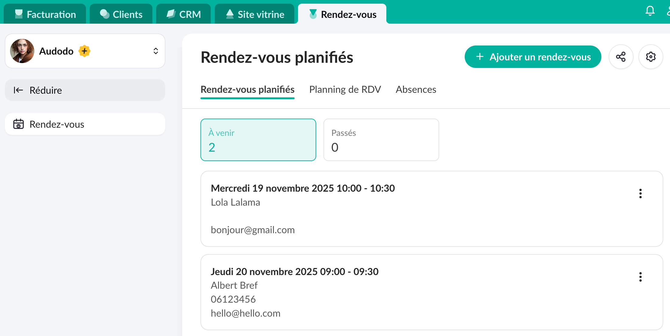Depuis l'onglet "Rendez-vous" de Facture.net, vous pouvez ajouter des rendez-vous manuellement, en plus de la programmation du calendrier de vos disponibilités.
