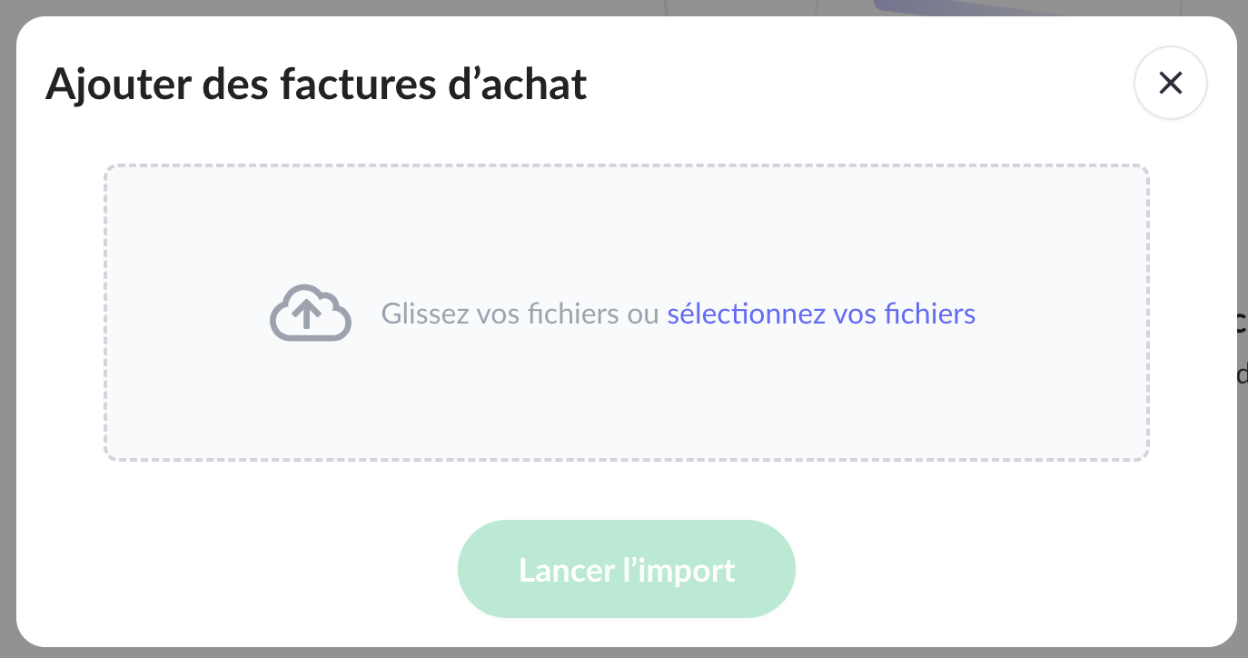 Accédez à la rubrique « Factures d'achats » depuis le menu latéral de l'onglet "Facturation" et/ou cliquez sur « + » ou utilisez les options disponibles pour importer vos fichiers (PDF ; PNG ; JPEG).