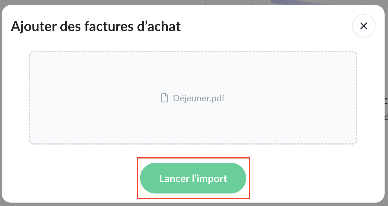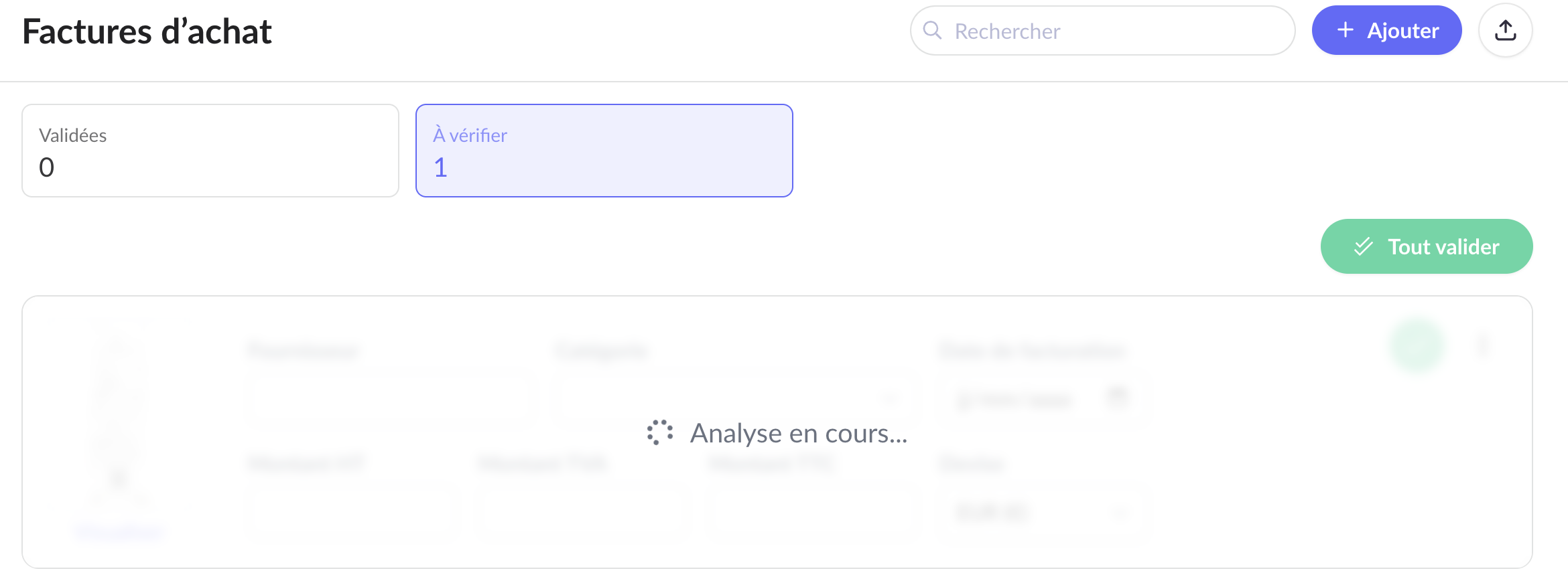 Les factures sont importées sans analyse. Vous devez remplir manuellement les informations suivantes : fournisseur, catégorie, montant HT, montant TVA, montant TTC, date de facturation et devise.