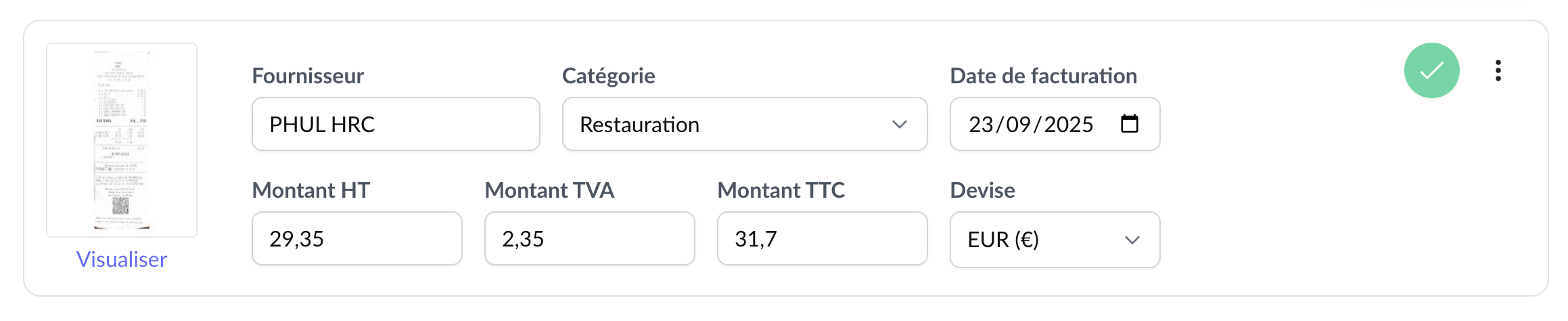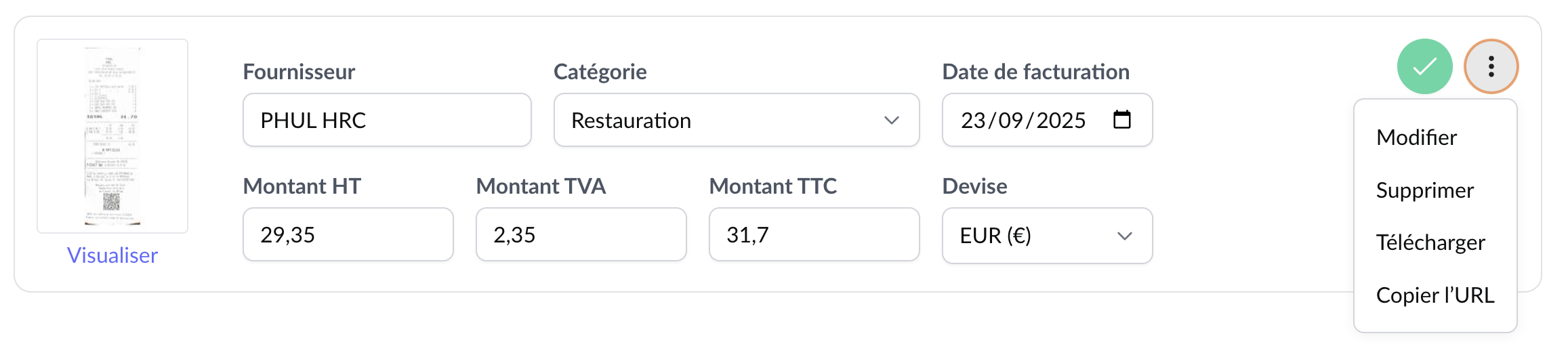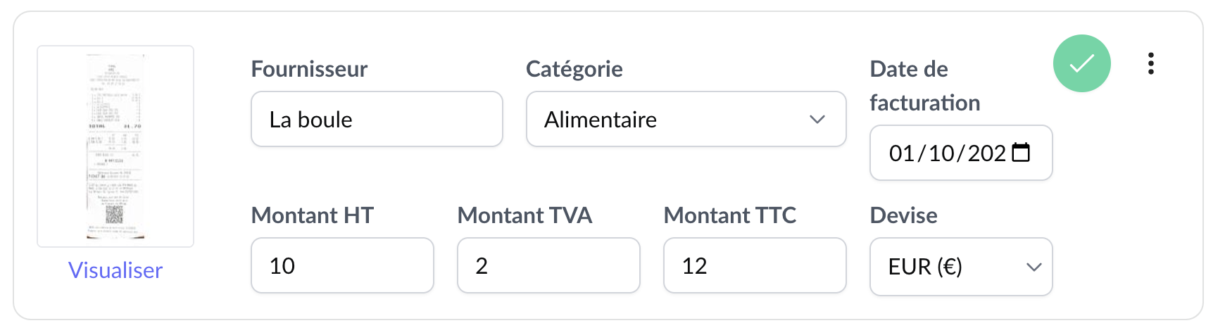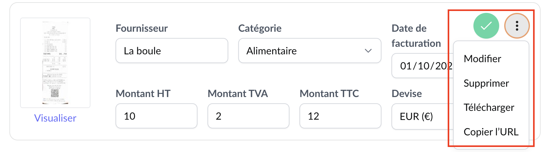 Après avoir vérifié ces informations, vous pouvez valider la facture d'achat en cliquant sur le "check" à droite de la facture. A l'inverse, vous pouvez effectuer des modifications ou supprimer votre facture d'achat à l'aide des 3 points verticaux.