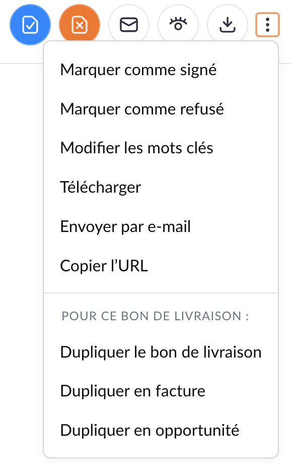 Ces actions sont disponibles en cliquant sur les 3 points verticaux, en haut, à droite du bon de livraison.