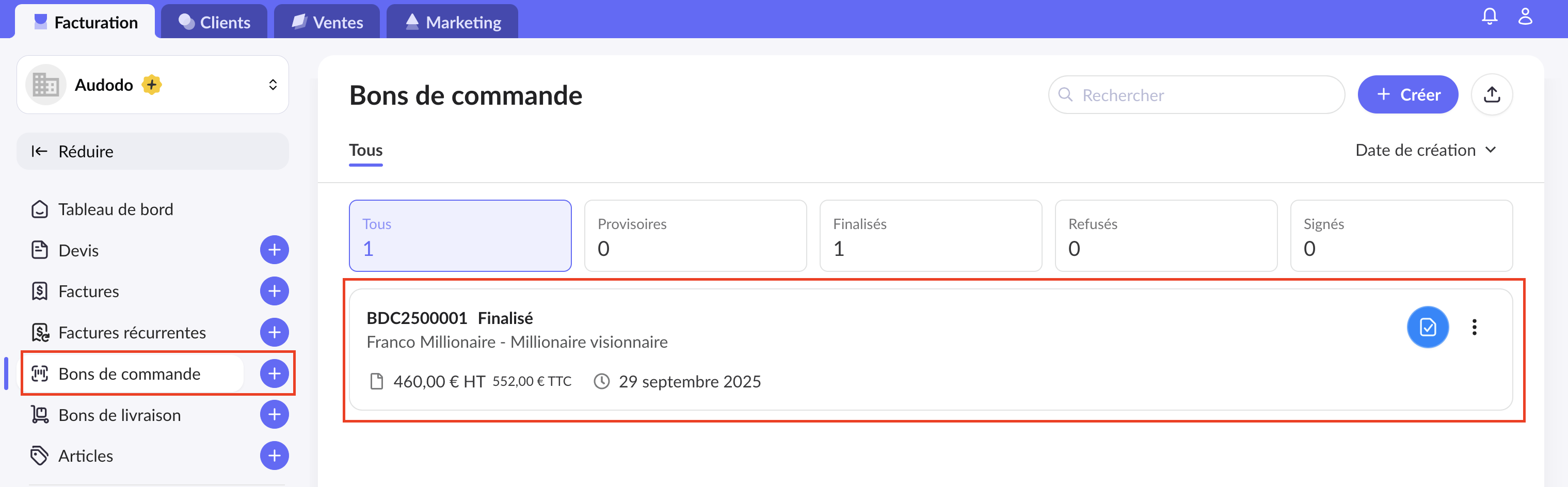 Retrouvez votre bon de commande parmi la liste des bons de commande créés et finalisés, puis sélectionnez-le.