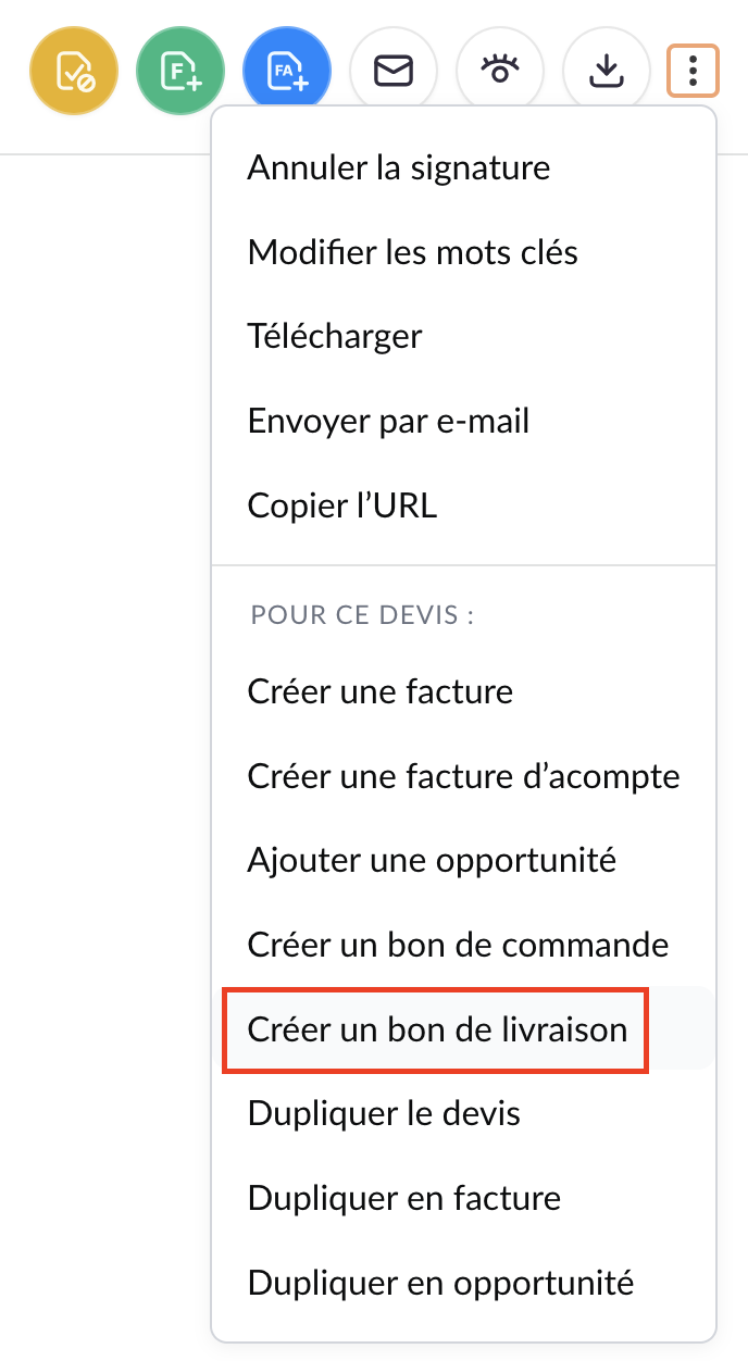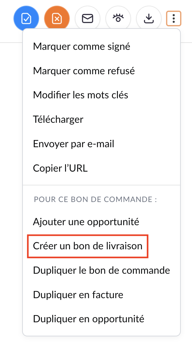 Ensuite, cliquez sur les 3 points verticaux, en haut, à droite de votre écran, pour accéder au menu des actions. Cliquez ensuite sur "Créer un bon de livraison".