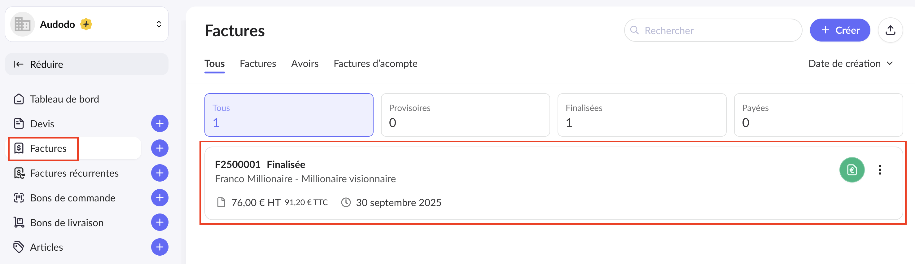 Retrouvez votre facture parmi la liste des factures créées et finalisées, puis sélectionnez-la.