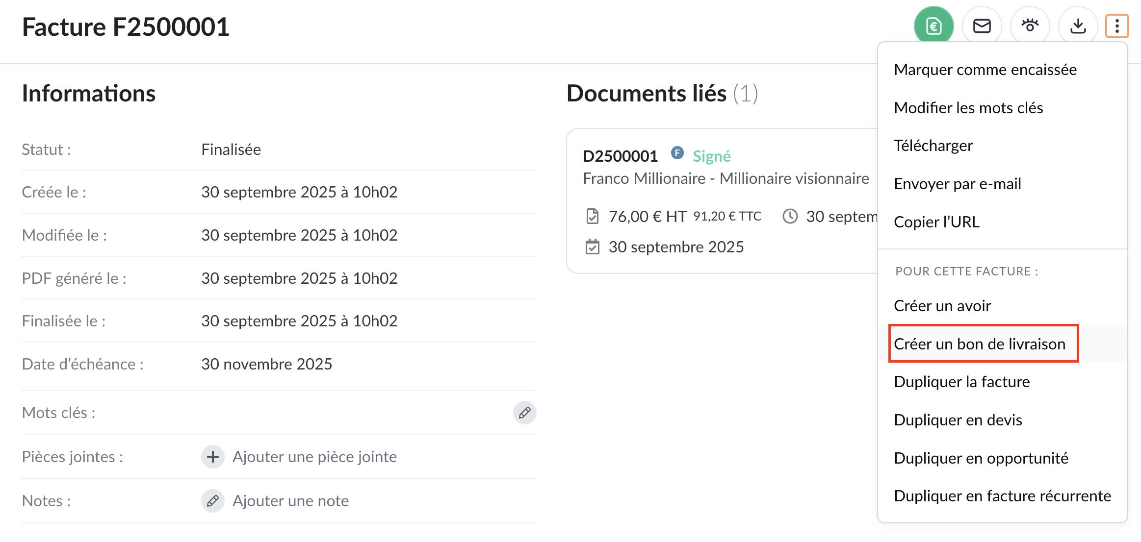 Ensuite, les informations de la facture sont automatiquement reprises. Il ne vous reste plus qu'à les vérifier avant de créer et finaliser votre bon de livraison.