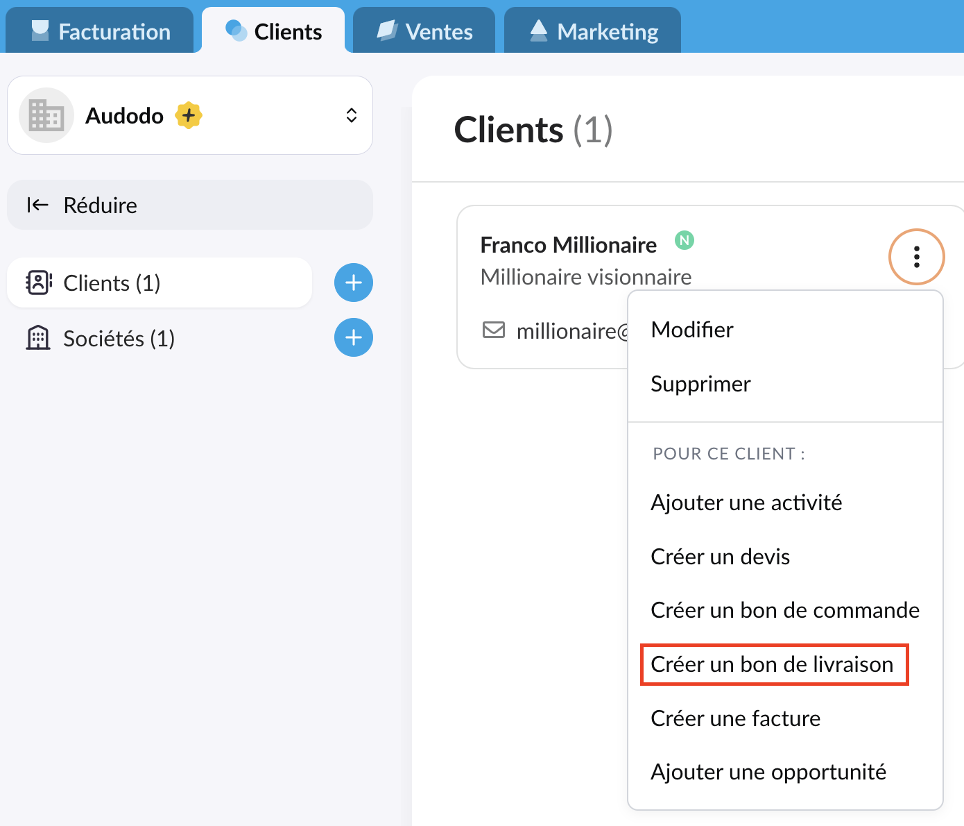 2. Puis cliquez sur les 3 points verticaux de la fiche client/société pour accéder au menu des actions. Cliquez ensuite sur "Créer un bon de livraison".