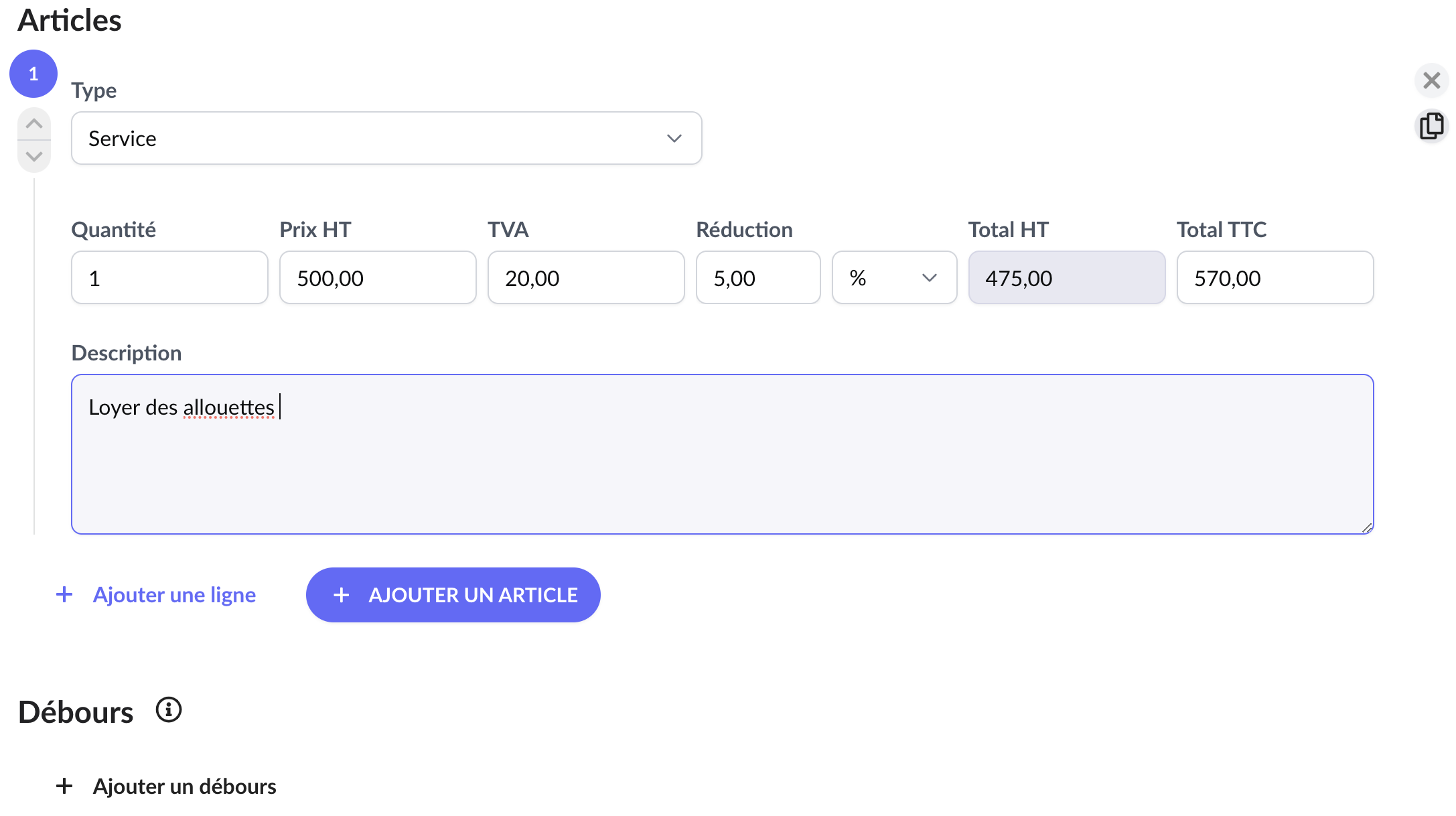 Indiquez les quantités, prix HT, TVA, et réductions éventuelles.