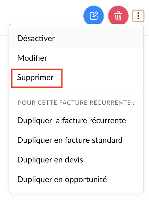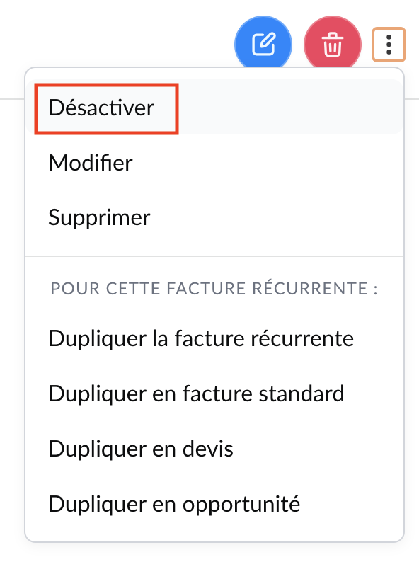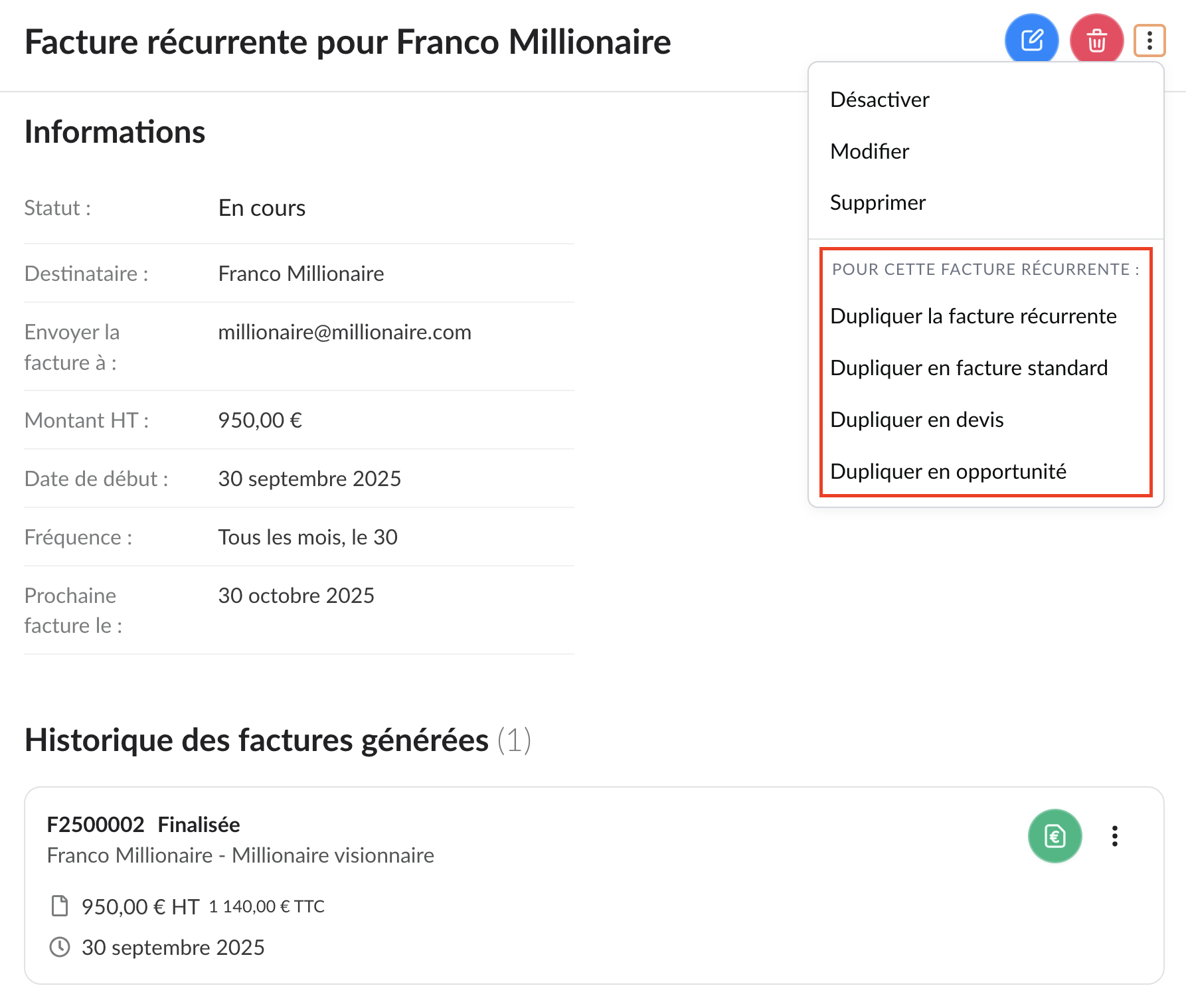 A noter qu'à partir d'une facture récurrente, vous pouvez dupliquer et créer une nouvelle facture récurrente, une facture, un devis ou une opportunité, à l'aide des 3 points verticaux en haut, à droite de votre facture récurrente.