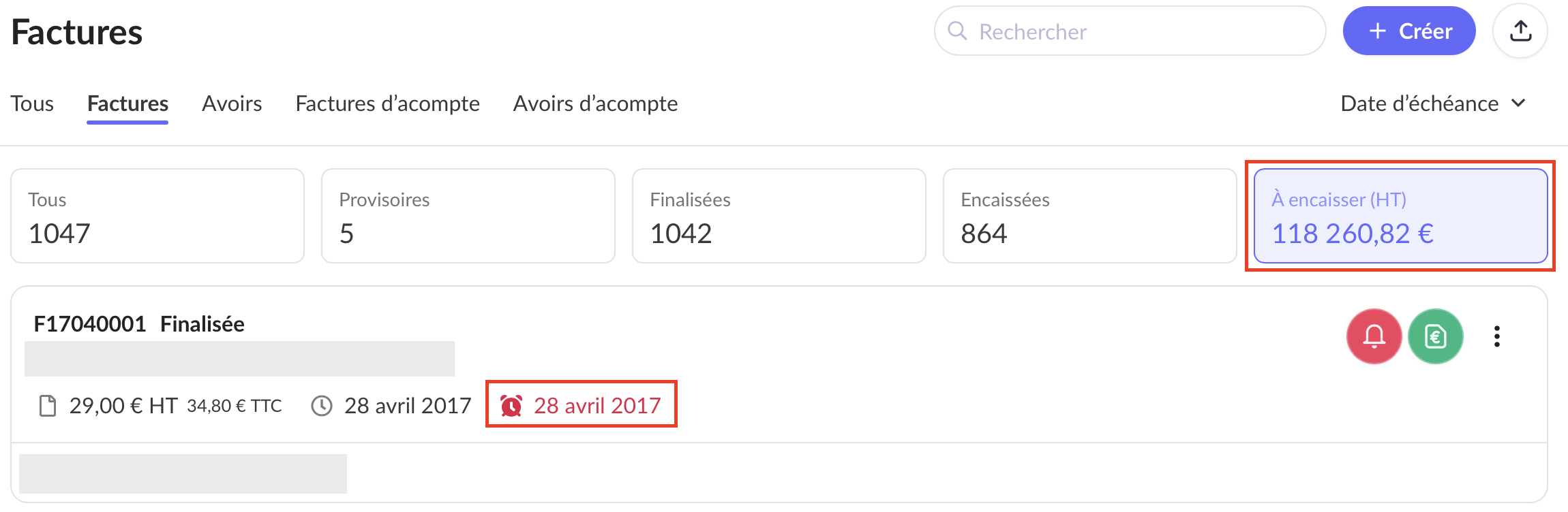 Avec l'abonnement Facture+, lorsque votre échéance de paiement est passée (date notée en rouge sur la facture), votre facture est alors identifiée en retard de paiement (statut "à encaisser"), comme indiqué ci-après.