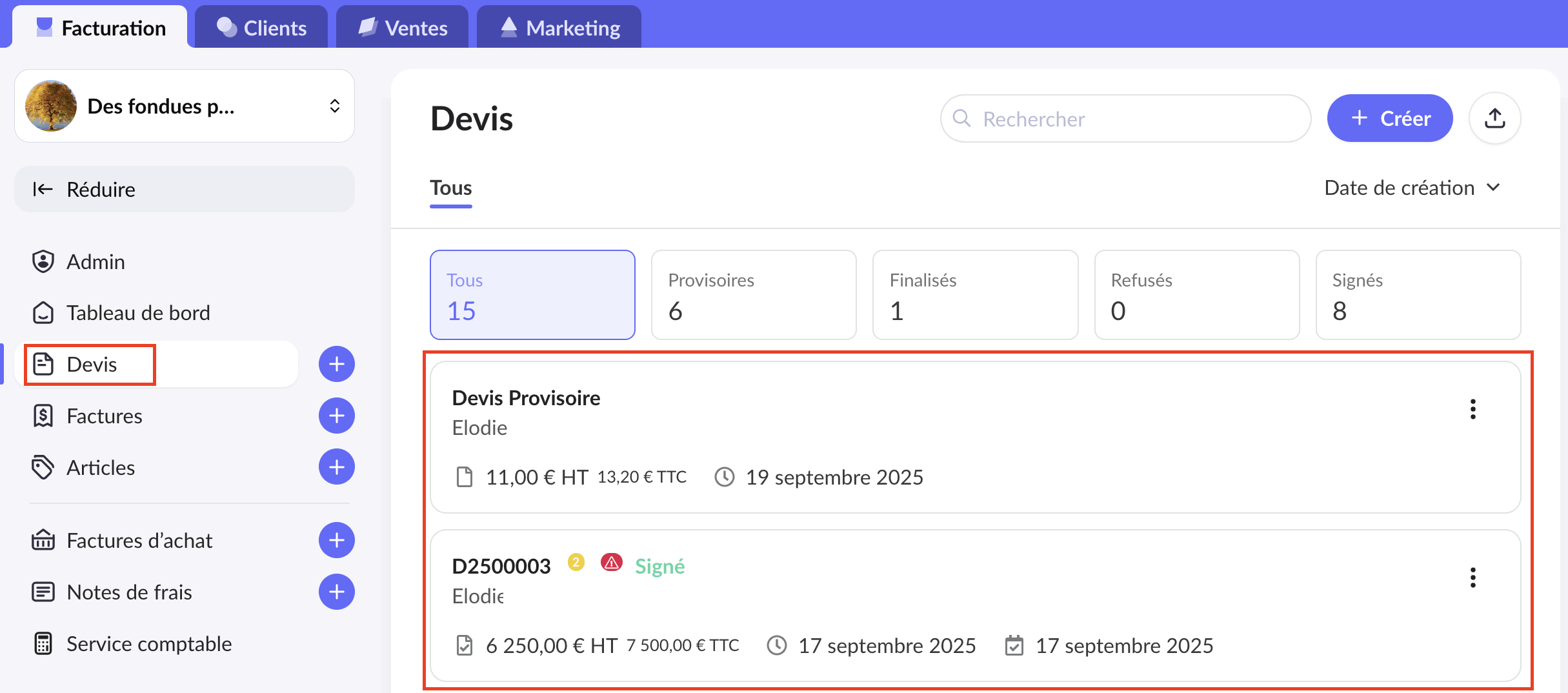 Depuis votre écran d'accueil, cliquez sur "Devis" et cherchez le devis que vous souhaitez télécharger.