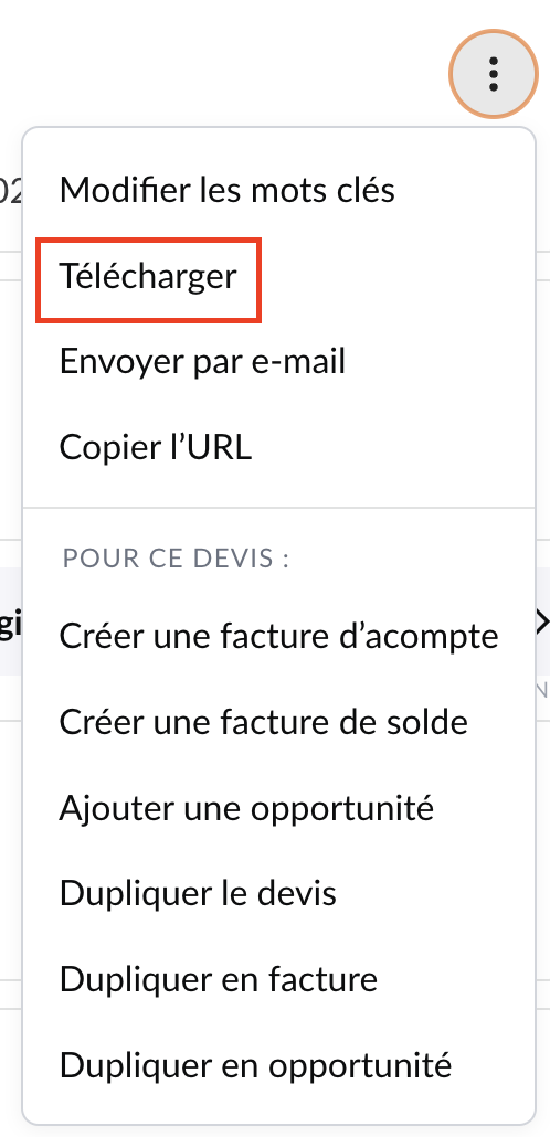 Cliquez sur les 3 points verticaux, à droite du devis concerné pour ouvrir la liste déroulante et cliquez sur "Télécharger".
