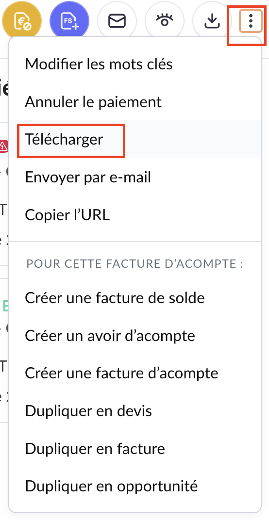 Lorsque vous avez créé votre facture, il vous suffit de cliquer en haut, à droite de votre écran sur l'icône "flèche vers le bas".