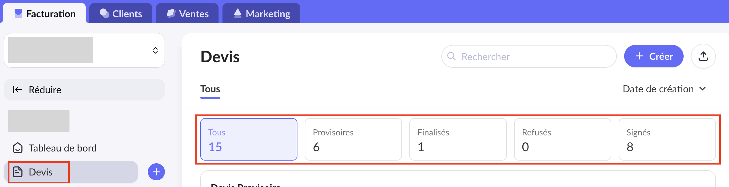 1. Allez dans la rubrique "Devis" du menu situé à gauche de votre écran, puis recherchez et sélectionnez le devis concerné.