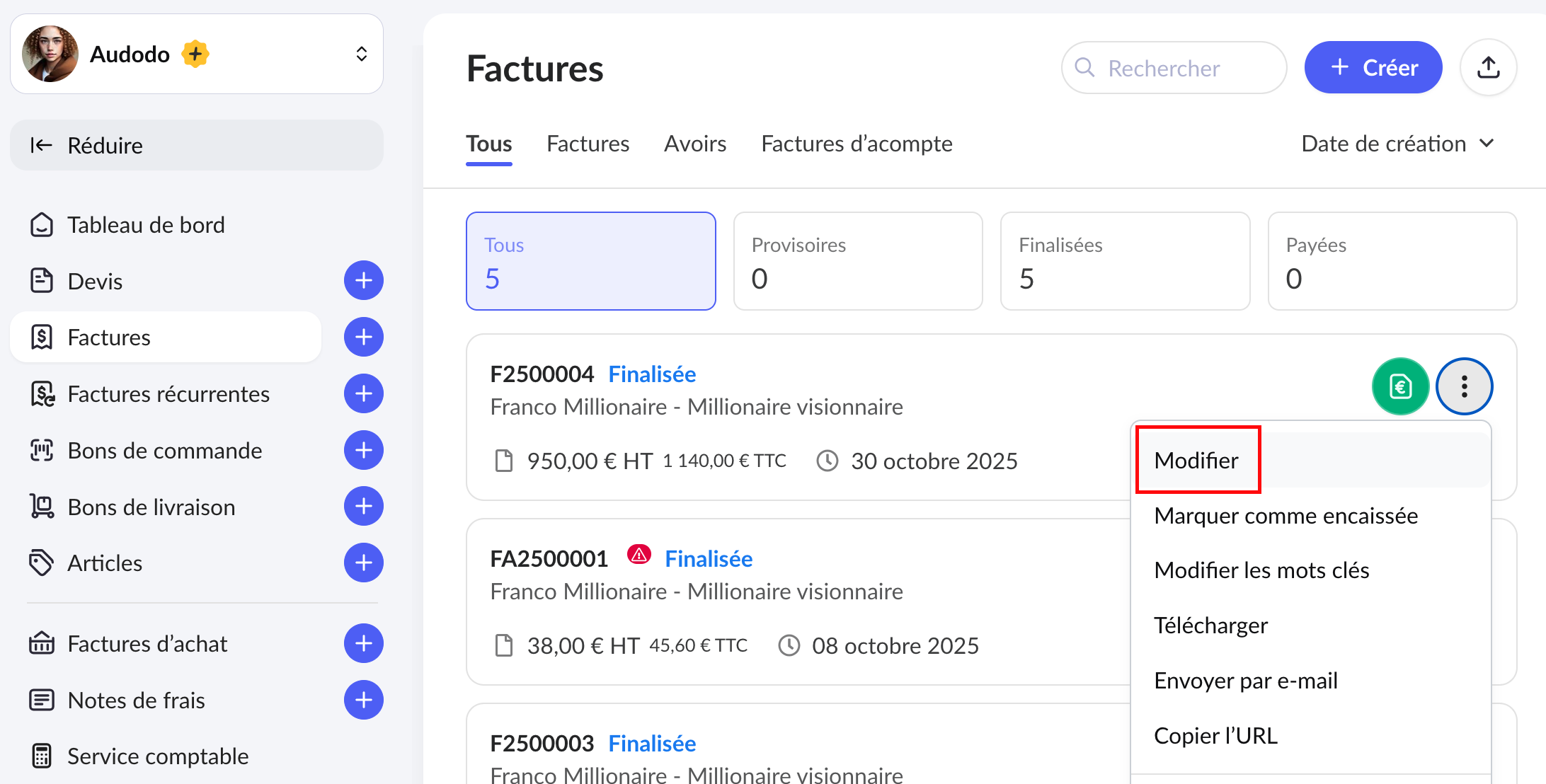 1. Rendez-vous sur la facture concernée, cliquez sur les 3 points verticaux, puis sur "Modifier".