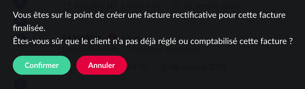 2. Ensuite, confirmez votre souhait de créer une facture rectificative en cliquant sur "Confirmer".