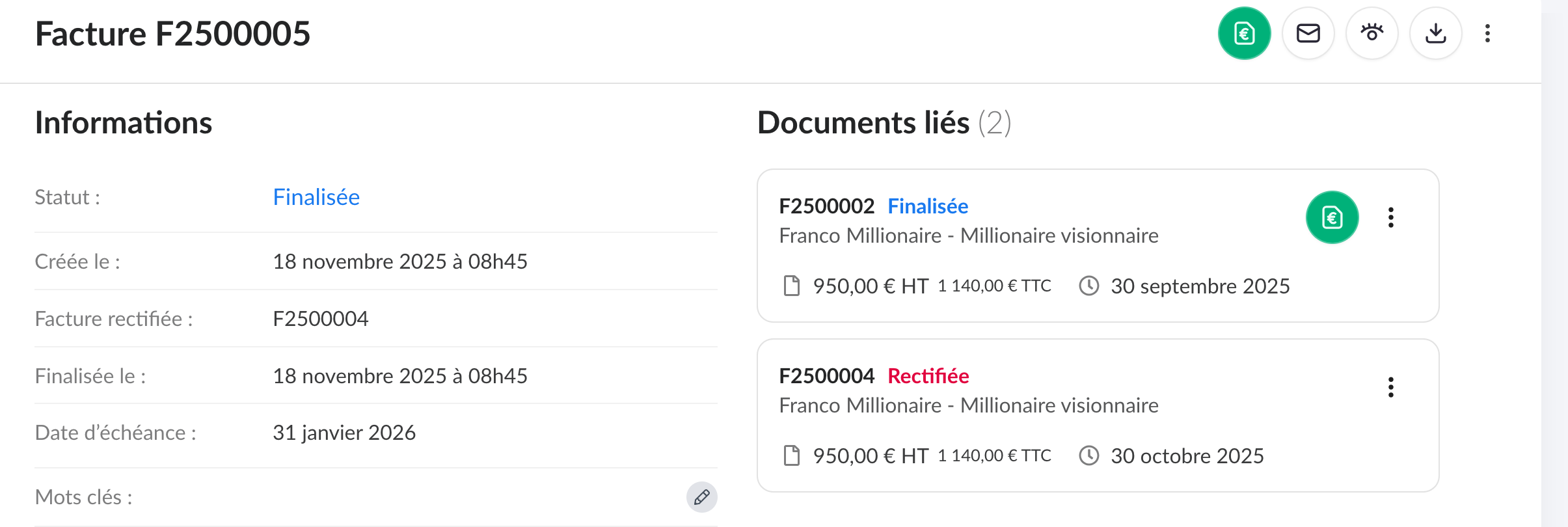 A noter que l'historique de la facture erronée est conservé et lié. La distinction s'effectue par le statut "Finalisée" et "Rectifiée".