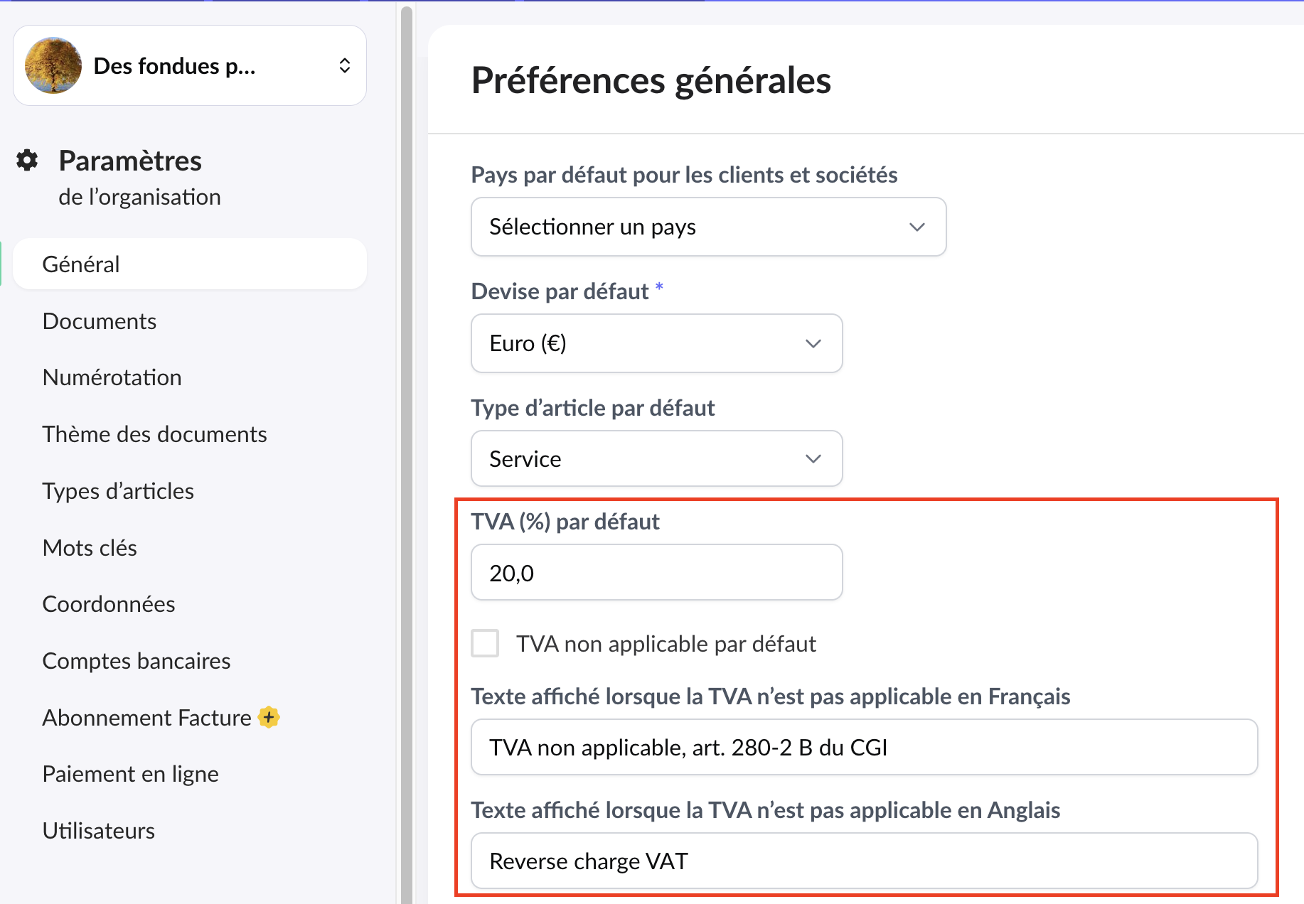 Il est possible de paramétrer l'exemption de TVA depuis les paramètres de votre compte, dans la rubrique "Général".