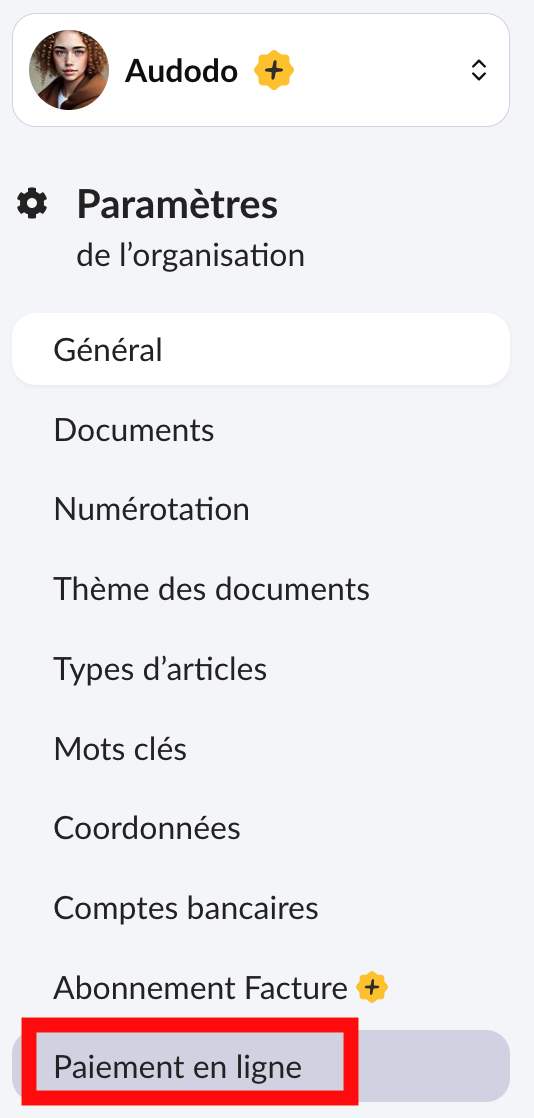 2. Puis, dans les paramètres de votre compte, cliquez sur la rubrique "Paiement en ligne".