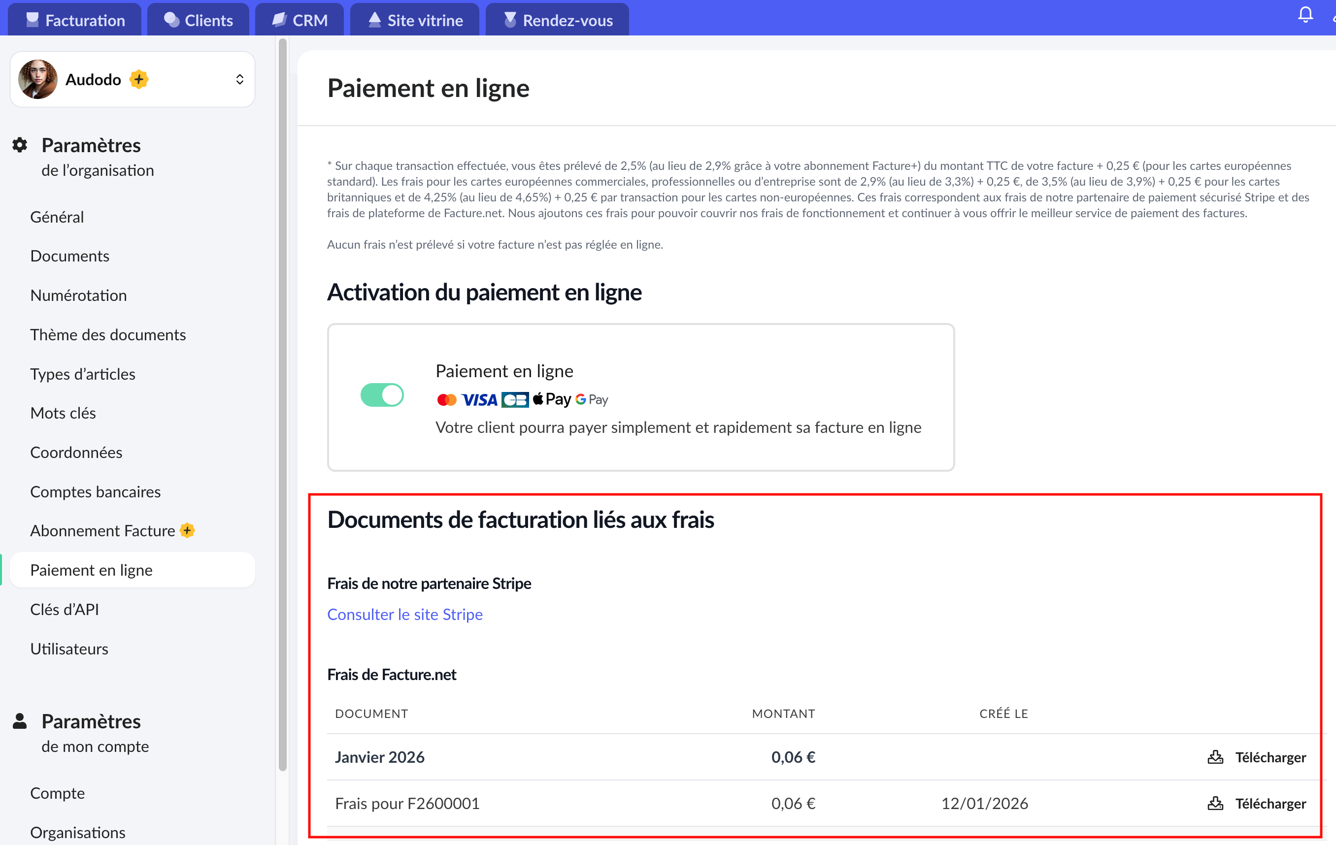 Lorsque vos clients payent vos factures en ligne, via Stripe, des frais de commissions sont prélevés par Facture.net et Stripe.