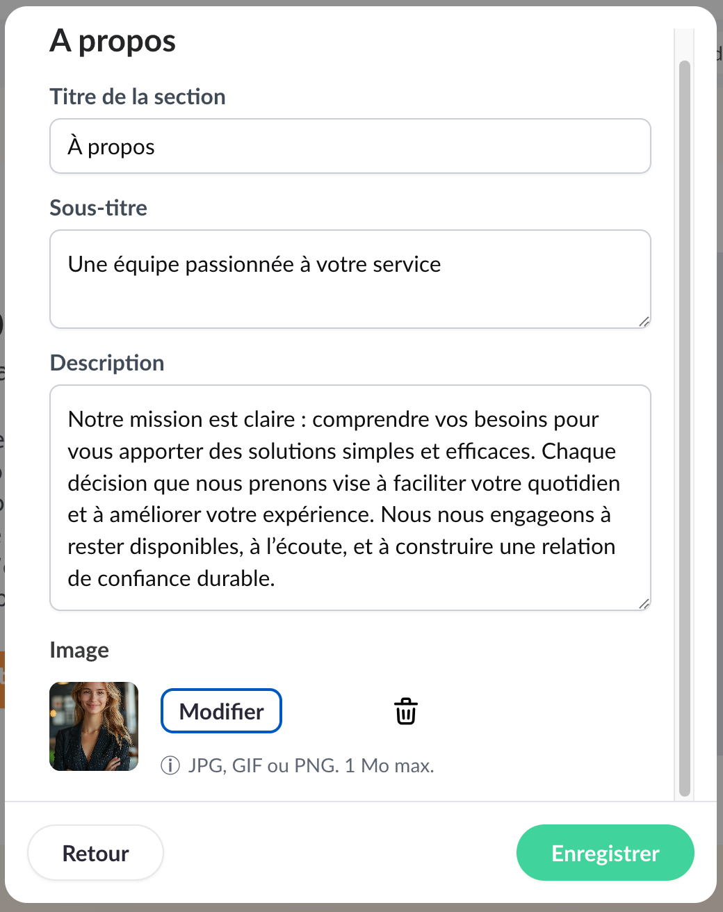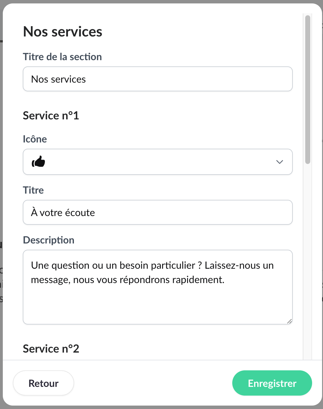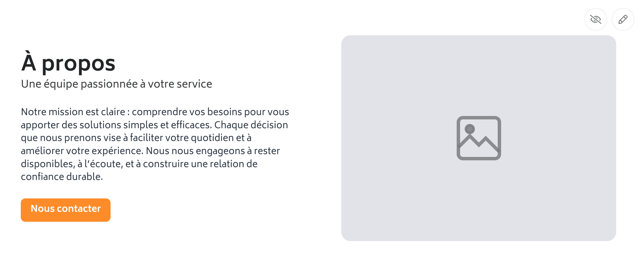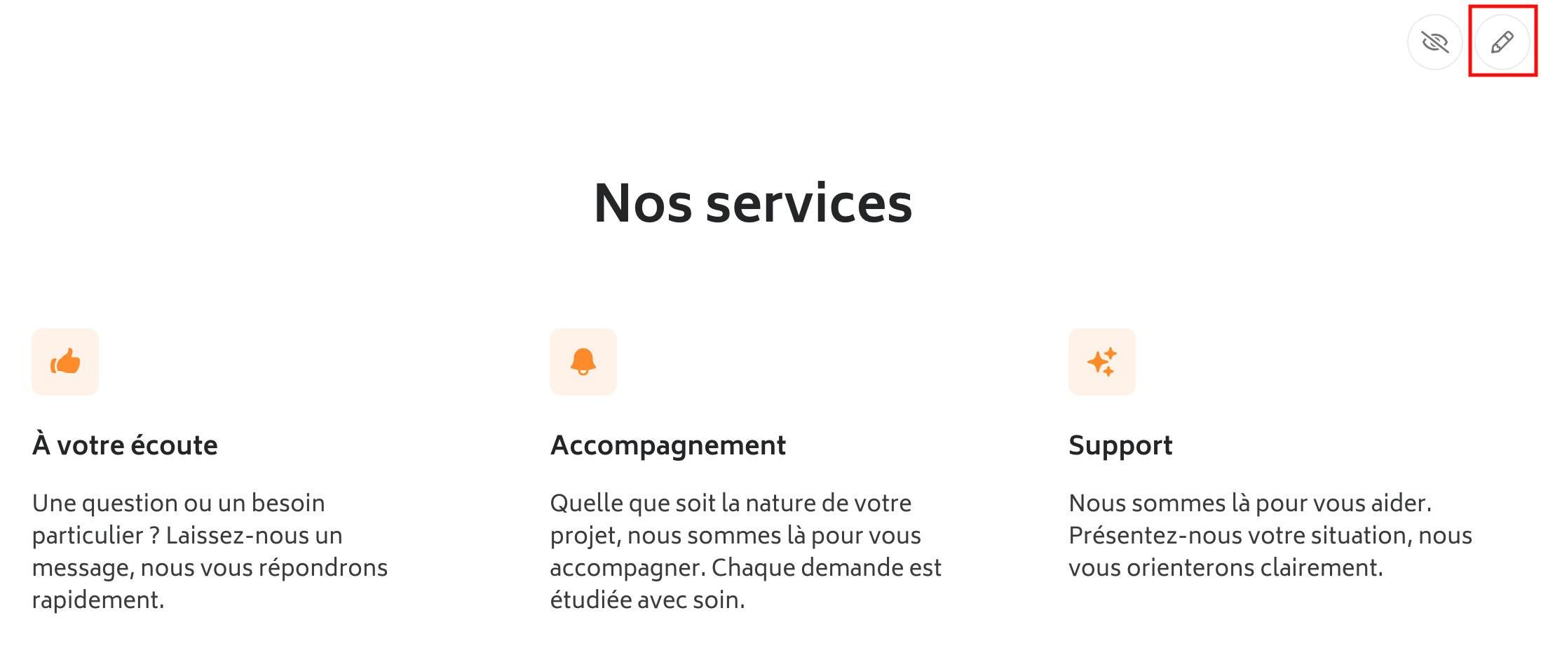 La section "Nos services" est définie ainsi par défaut. Vous pouvez toutefois changer son intitulé et ses informations en cliquant sur l'icône du crayon, en haut, à droite de votre écran.