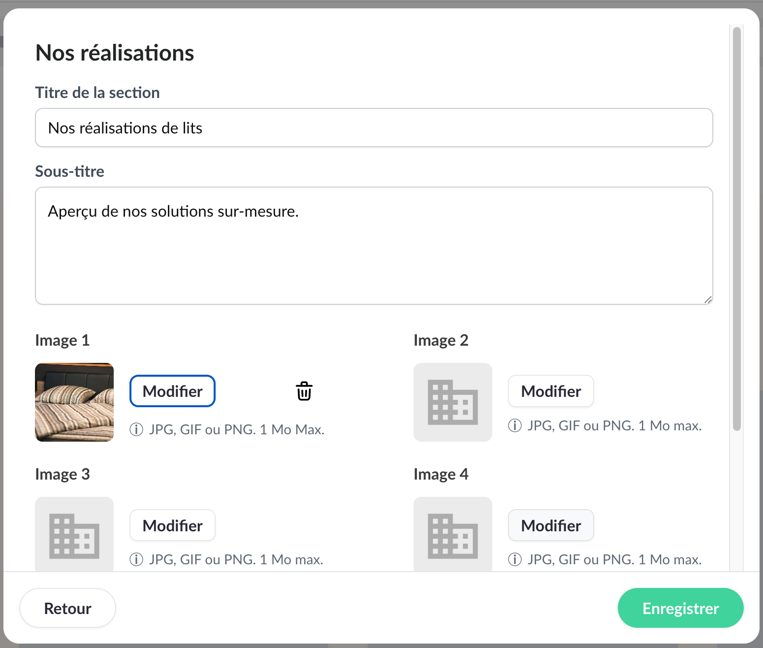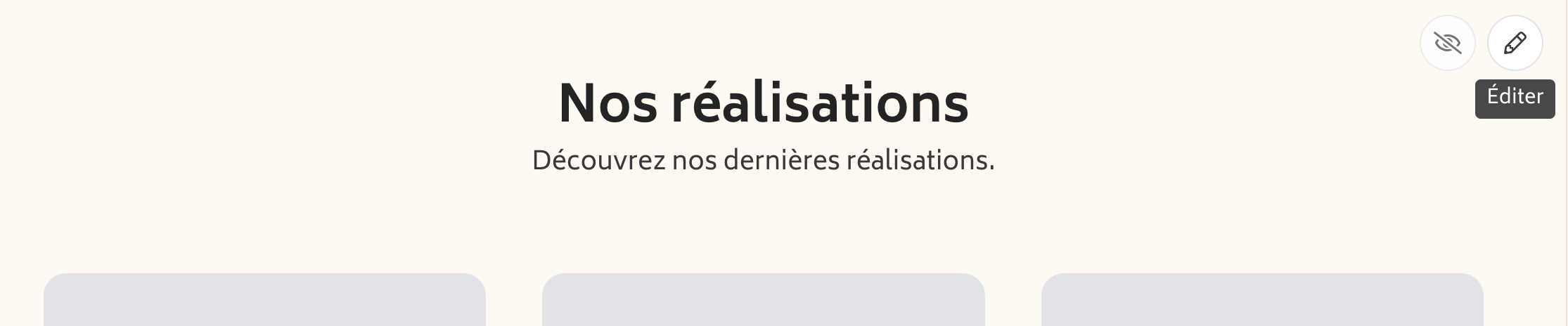 Lorsque vous êtes sur la section "Nos réalisations", cliquez sur l'icône du crayon, en haut, à droite de la section.